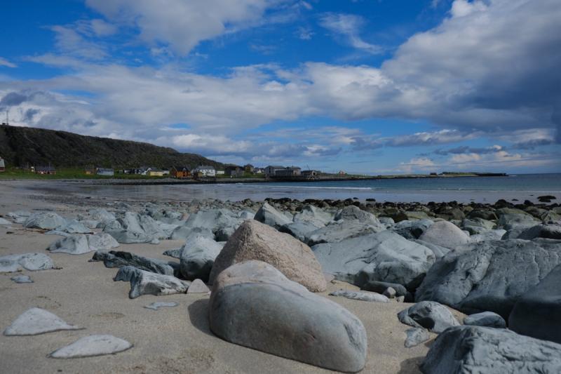 Am ersten Tag sind wir die sehr schmale Straße zu dem verlassenen Dorf Hamningberg gefahren. Der Ort wird nur im Sommer als Feriendorf genutzt. Im Winter ist das Dorf verlassen und die Straße geschlossen. Die Straße führt durch eine arktische Felslandschaft ohne hohe Vegetation. Nur niedrige Pflanzen wachsen dort und ernähren die Schafe und Rentiere.
