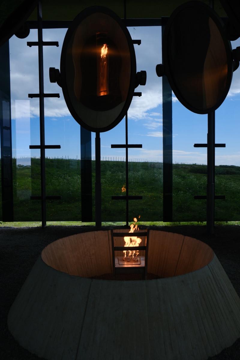 Im Pavillon daneben steht ein brennender Stuhl umgeben von 7 hohen Spiegeln. Diese Skulptur symbolisiert einen Scheiterhaufen.