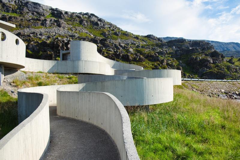 Nach einer kurzen Pause fuhren wir die 66 km lange Nationale Touristenroute nach Havøysund. Die einsame Straße führt am Meer entlang durch eine karge und zerklüftete Felslandschaft. Die Rastplätze an den Touristenroute sind immer besonders gestaltet. Am architektonisch überraschenden Rastplatz Selvika machten wir abends ein Picknick am Strand.