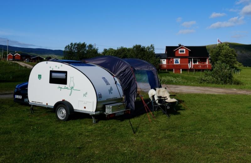 Nach einer langen Fahrt auf holperige Straßen über das einsame Fjell erreichten wir bei Regen unseren Campingplatz Farmen Syltefjord Camping.